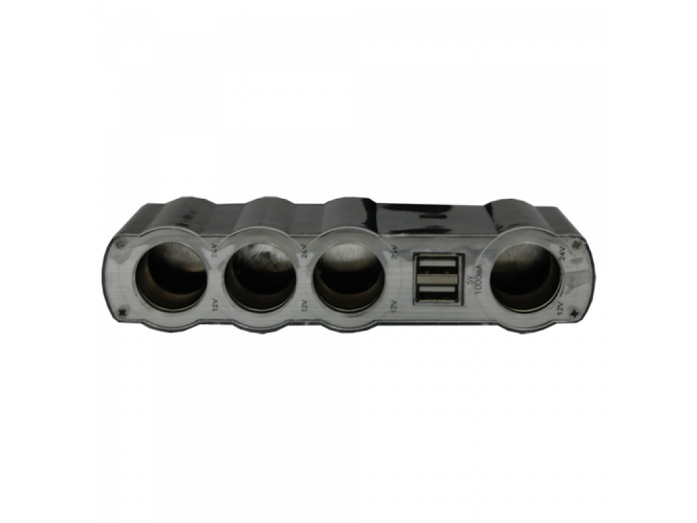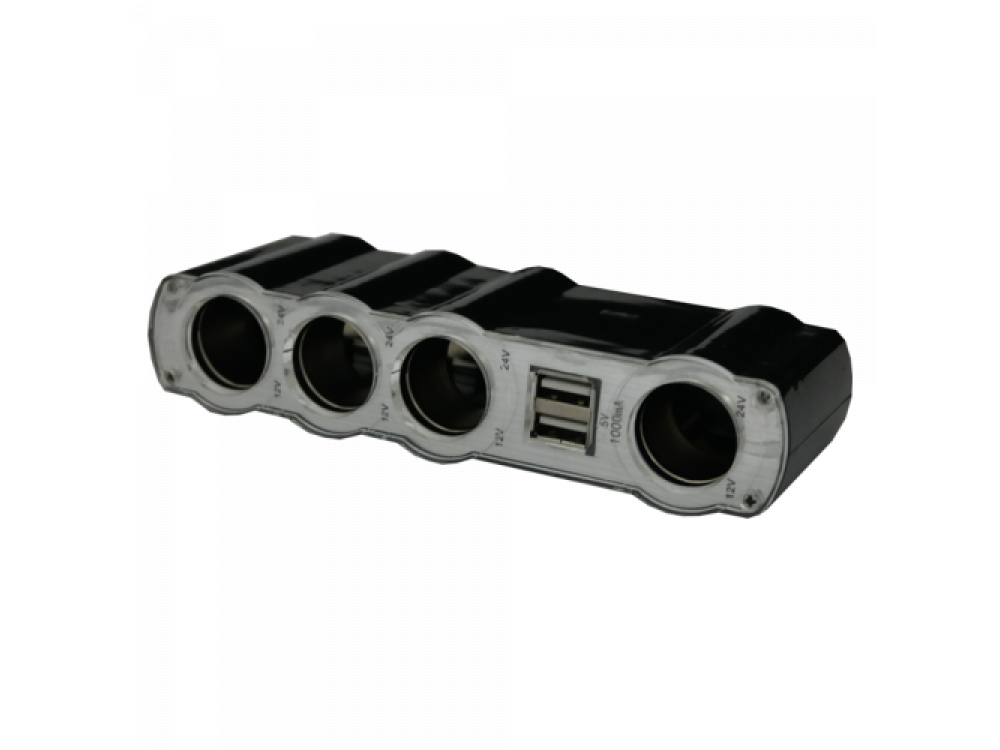 Разветвитель гнезда прикуривателя (12/24 В) на 4 входа с максимальным суммарным током нагрузки 10 А + зарядное устройство с 2 USB входами (5 V / 1000 mA).