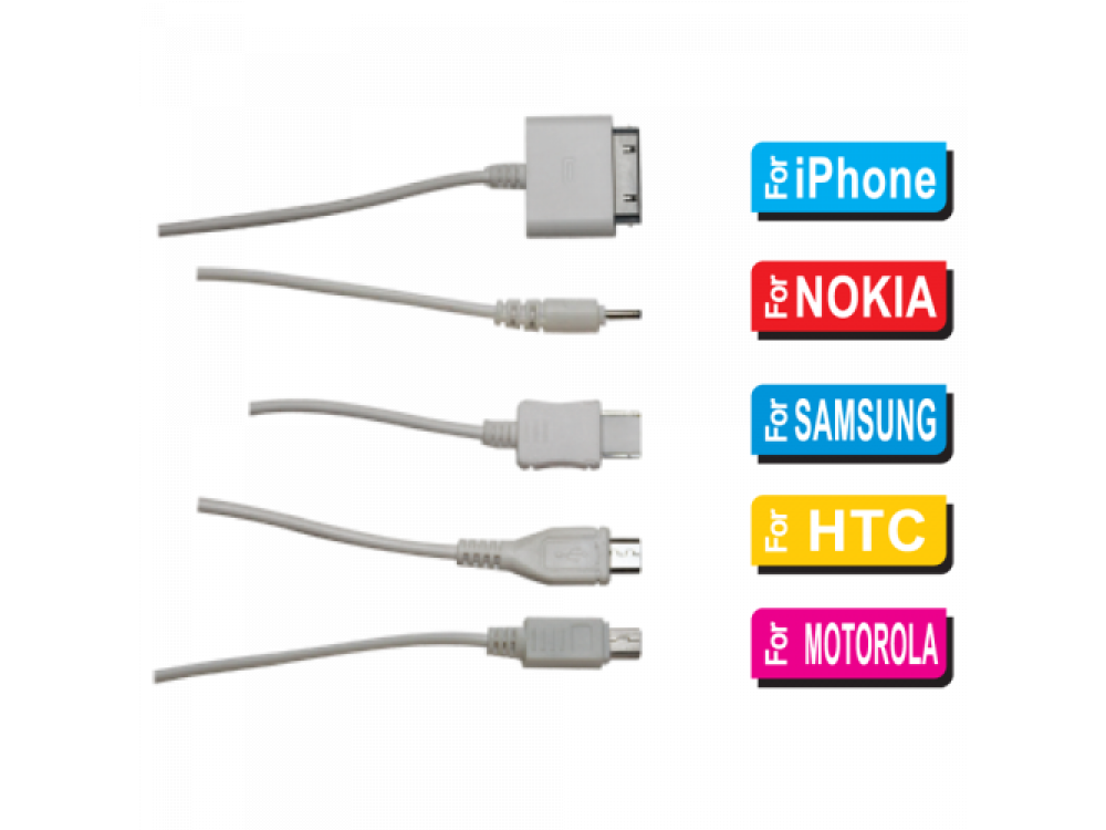 - Универсальный провод-зарядка на 5 типов приборов (Apple, Nokia, Samsung, HTC, Motorola).