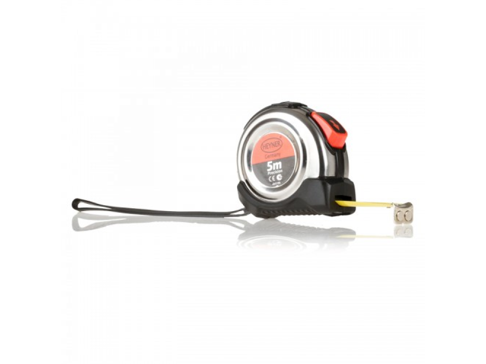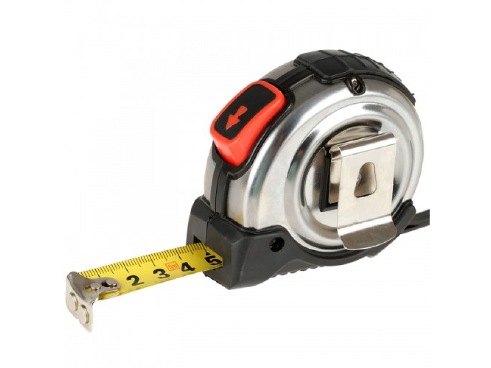 Рулетка профессиональная 5 м. Функция - автоматический стоп. Металлический корпус резиновым покрытием. Поясной зажим и наручный ремешок.