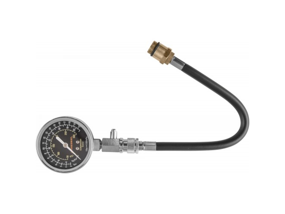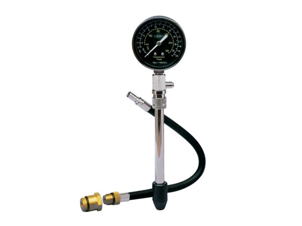 Прибор для диагностики работоспособности и обнаружения неисправностей цилиндро-поршневой группы и газораспределительного механизма бензиновых двигателей внутреннего сгорания. Изделие комплектуется 64-миллиметровым манометром, имеющем шкалы градуировки до 21 кгс/смкв. в различных величинах: psi, Bar, кгс/смкв., ниппельной насадкой, длиной 150 мм, гибким шлангом, длиной 325 мм с двумя резьбовыми адаптерами для свечных отверстий М14 и М18. Прибор используется для диагностики двигателей с осложненным доступом к свечным отверстиям и двухвальных двигателей, с расположением свечных отверстий в "колодцах"