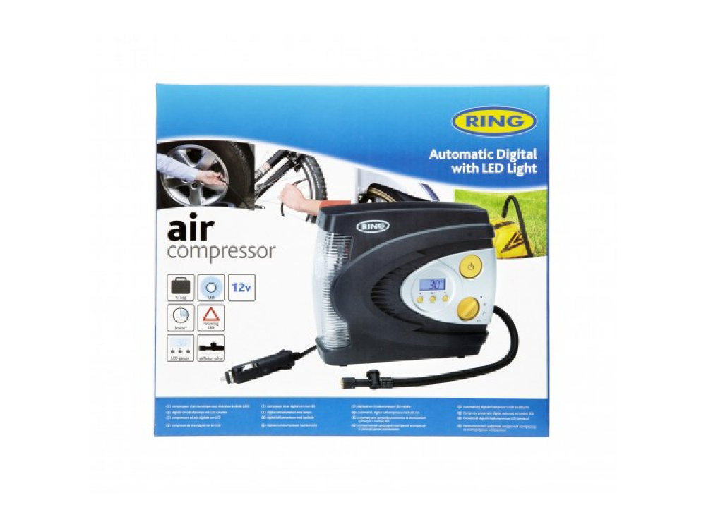 Цифровой надувной шинный компрессор Ring RAC630 12 В. Имеет светодиодный фонарь для подсветки, Красный светодиод для SOS и белый свет для ночного освещения, с режимом работы красного излучения необходим, если вам нужно накачать шину на обочине дороги в темноте, вы можете сделать это безопасно. С функцией автоматического отключения после достижения заданного давления. RAC630 накачивает 13-дюймовую шину от 0 фунтов на квадратный дюйм до 35 фунтов на квадратный дюйм менее чем за 3 минуты, экономя ваше время. В комплекте с трехсекционным адаптером, подходящим для накачивания спортивных мячей и небольших надувных лодок, и удобным футляром для хранения, позволяющим безопасно хранить компрессор в вашем автомобиле когда не используется.
