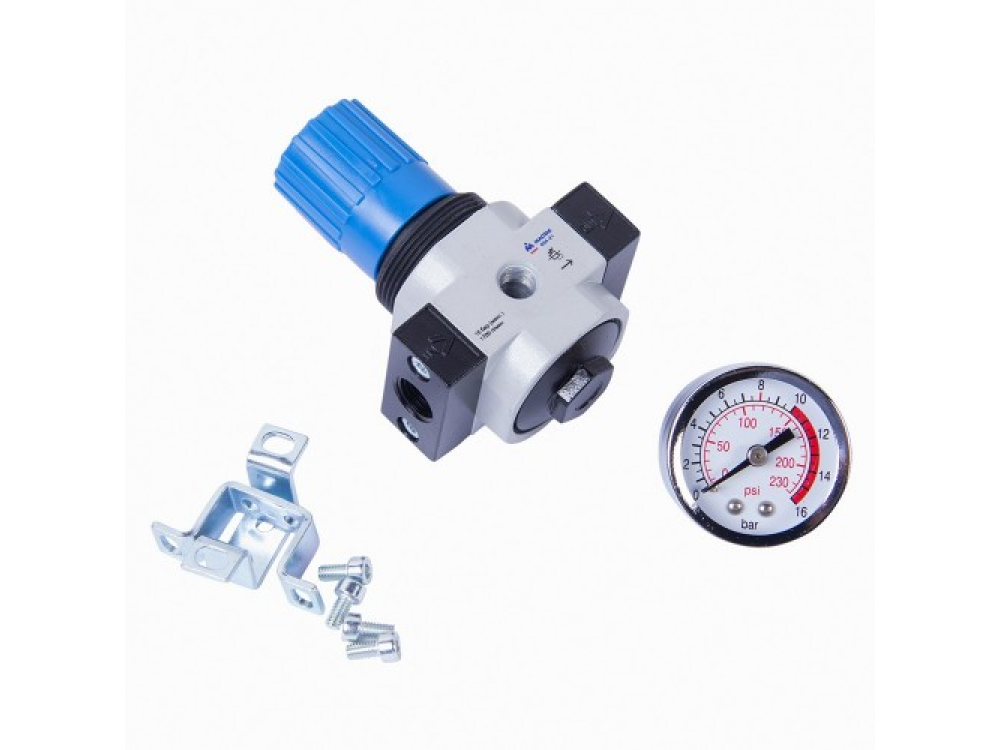 Манометр регулятор 1/4", МАСТАК 694-21 для регулировки давления сжатого воздуха в пневматической линии. Область применения: Автосервис, СТО. Конструкция устройства - Редуктор: выставление номинального давления на выходе, необходимого для нормальной работы инструментов и оборудования. Механизм редуктора встроен в блок фильтра. - Манометр: контроль давления, устанавливаемого редуктором. Манометр установлен на корпусе блока фильтра. Меры предосторожности - Соблюдайте правильность подключения в воздушную магистраль. - Не подключайте устройство к магистрали, давление в которой превышает максимально допустимое. Технические характеристики - Рабочее давление, бар 1,5 - 12 - Максимальное давление, бар 16 - Пропускная способность, л/мин 1700 - Рабочий диапазон температур от -10 до 60°С - Соединение, резьба вход/выход 1/4” внутр. / 1/4” внутр. - Габариты, мм 185х72х45 - Вес, кг 0,5