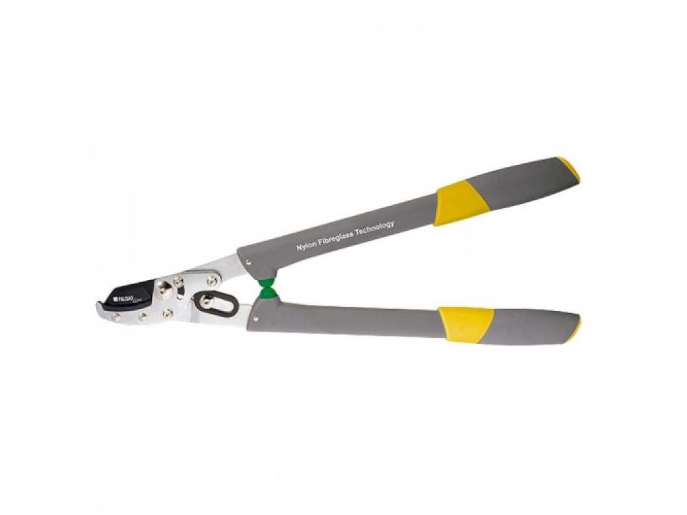 Сучкорез с упорной наковальней, облегченные рукоятки. Верхнее режущее лезвие выполнено из японской стали SK5 и покрыто тефлоном для снижения трения. Зубцы на наковальне удерживают ветку во время работы. Оснащен двухрычажным механизмом, который увеличивает силу реза на 40%. Рукоятки из армированного стекловолокном полиамида с двухкомпонентными ручками уменьшают вес изделия и облегчают работу с инструментом. Предназначен для дистанционной обрезки живых веток деревьев и кустарников диаметром до 35 мм.