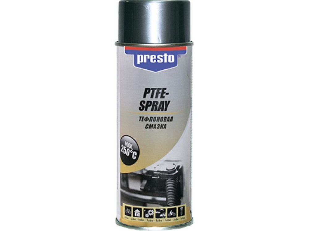 PRESTO Смазка тефлоновая на основе минерального масла и тефлона для автомобилей, бытового и промышленного применения. Обладает отличными водоотталкивающими свойствами. Уменьшает трение, износ, заедание механизмов из металла и пластмасс, препятствует образованию коррозии. PH-нейтральна, не содержит силикона. Безвредна для покрышек и изделий из резины и пластика. Устойчива к слабым кислотам, солям и щелочам. Рабочий диапазон температур от -50°С до +250°С.