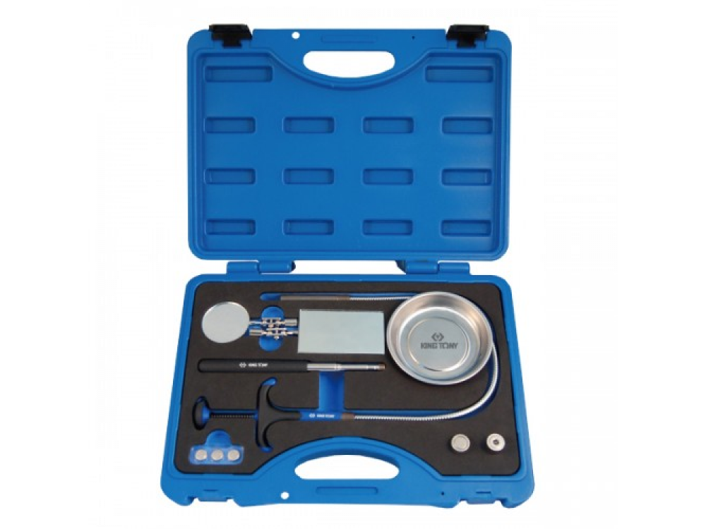 Инспекционный набор King Tony 9TQ01 составлен из семи приспособлений и аксессуаров, с помощью которых можно заглянуть в труднодоступное место, подсветить узел агрегата, достать упавшую в недра двигателя небольшую деталь или мелкий крепеж. В состав инспекционного набора King Tony 9TQ01 входят: • телескопическая ручка для подсоединения аксессуаров – 1 шт.; • магнитная насадка (до 1,5 кг) с светодиодной подсветкой – 1 шт.; • магнитная насадка (до 3,6 кг) – 1 шт.; • зеркало круглое ? 50 мм – 1 шт.; • зеркало прямоугольное 89х50 мм – 1 шт.; • захват гибкий – 1 шт.; • тарелка магнитная ? 100 мм – 1 шт.; • пластиковый кейс – 1 шт. Применяется в автосервисах, на станциях технического обслуживания автомобилей (СТОА), в шиномонтажных мастерских, ремонтных зонах автопредприятий, а также в частных гаражах продвинутых автовладельцев. Слесарный инструмент King Tony - это профессиональный ручной инструмент для ремонта автомобилей, который способен выдерживать высокие нагрузки и ежедневную эксплуатацию.