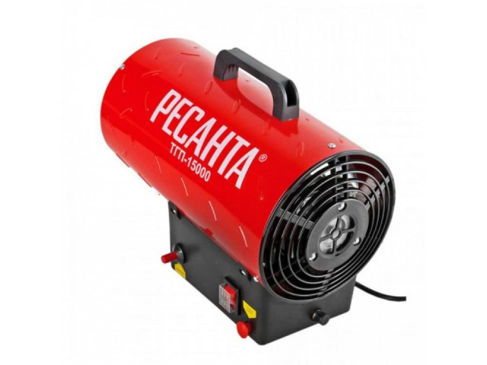 Газовая тепловая пушка РЕСАНТА ТГП-15000 – воздухонагреватель, работающий на сжиженном газовом топливе. Топливо необходимо для получения горячей атмосферы в камере сгорания, а электроэнергия, подводимая к устройству, необходима для питания вентилятора, нагнетающего воздух, и для функционирования автоматики. Газовые пушки прямого нагрева являются простой и надёжной конструкцией без дымохода, где горячий воздух из устройства поступают в помещение.