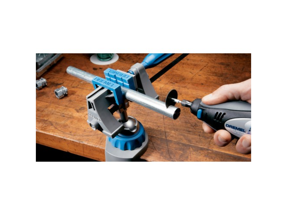 Многофункциональные тиски Dremel 3-в-1. Стационарные тиски, отдельный крепёжный элемент и подставка для инструмента.