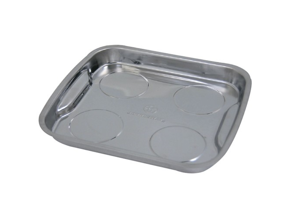 Биметаллический лоток прямоугольной формы 295х275 мм, применяется для удержания во время ремонта техники железосодержащих деталей и инструментов крупных размеров (болты, гайки, шайбы, ключи, торцевые головки, ШГИ и т.д.). В поддоне надежно удерживаются детали в горизонтальном, вертикальном и перевернутом положении. Суммарная масса удерживаемых деталей может составлять до 6 кг, в вертикальном положении тарелки и 5 кг в перевернутом, благодаря применению четырех мощных неодимовых магнитов. Крышки магнитов, изготовленные из мягкой резины, защищают поверхности от возможных повреждений.