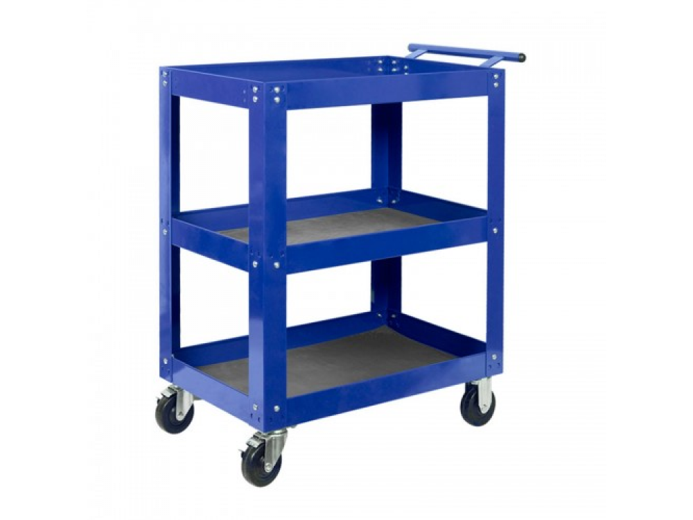 Тележка открытая, 3 полки, синяя МАСТАК 520-33720B предназначена для организации рабочего места в автосервисе, на станции технического обслуживания, в гараже, а также в любом другом производственном помещении. Размещение инструментов в тележке по типу и назначению позволяет создать на рабочем месте порядок и упрощает работу мастера. Корпус инструментальной тележки изготовлен методом сварки из листовой стали с усиленными ребрами жесткости. Поверх нанесено порошковое покрытие, стойкое к износу и ударным воздействиям. Общая допустимая нагрузка на тележку составляет 450 кг. Тележка оснащена 3 ящиками размером 580х406х75 мм каждый и одним – размером 580х406х150 мм. Все ящики выдвижные и съемные, направляющие на роликовых подшипниках. Допустимая нагрузка на каждую полку составляет до 20 кг. Кроме этого каждый ящик укомплектован кнопочным замком, защитным ковриком из мягкой вспененной резины и биркой (полоска из картона + защитная прозрачная лента) для маркировки полки или описания комплектации. Дополнительный отсек размером 580х406х300 мм и закрываемый на ключ позволяет хранить габаритный инструмент и приспособления. Также инструментальная тележка для автосервиса или мастерской имеет ручку-карман для мелочевки и управления при передвижении тележки, центральный замок, блокирующий открытие всех полок одним поворотом ключа, и защитный коврик из полимерного материала для защиты верхней столешницы тележки. Двое колёс поворотные и с блокировкой вращения. Тип тележки закрытая Технические характеристики: - Макс. нагрузка, кг 450 - Цвет красный - Центральный замок да - Количество ящиков, шт 4 - Отсек для хранения да - Размеры ящиков, мм 580х406 - Габариты, мм 680х460х955 - Нагрузка на ящик, кг 20 - Масса, кг 58 - Количество ковриков, шт 5