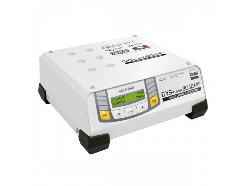 Gysflash 30,12 HF - это умное зарядное устройство с инверторной технологией для обслуживания аккумуляторных батарей 12В с емкостью от 10 до 400Ач. Безопасно заряжает, поддерживает заряд, а так-же позволяет, не теряя настроек автомобиля, заменить аккумулятор. Имеет 5 режимов работы и интуитивно понятный интерфейс. Подходит для подпитки автомобиля во время диагностики Преимущества - Зарядка АКБ с помощью аппарата с развернутой кривой зарядки - Подпитка АКБ 12В (с жидким или гелевым электролитом) автомобилей в процессе диагностики - Обеспечение хорошего состояния АКБ выставочного автомобиля в шоуруме - Компенсация электроэнергетических потребностей в целях сохранения настроек автомобиля во время замены АКБ - Использование зарядного устройства как источника стабилизированного питания, напряжение и максимальный ток которого можно настроить Особенности - Интуитивно понятный интерфейс - 8 языков - Идеальная высота чтобы поместить зарядное устройство под автомобиль - Автоматический перезапуск - Проверка и калибровка кабелей - Блокировка в режиме Showroom - Возможность упрощенной зарядки в режиме Easy - Активация и конфигурация кривой зарядки «Expert» - Автоматический запуск SOS recovery для сульфатированных АКБ - Поставляется с кабелями 2x2,5м сечением 6 мм? Технические характеристики Наименование Зарядное устройство Gysflash 30,12 HF #OFFER_46084_ALL# Зарядное устройство Gysflash 30,24 HF #OFFER_46085_ALL# Зарядное устройство Gysflash 50,12 HF #OFFER_46088_ALL# Зарядное устройство Gysflash 50,24 HF #OFFER_46089_ALL# Зарядное устройство Gysflash 100,12 HF #OFFER_46080_ALL# Максимальный ток зарядки 30 А 30 А/15А 50 А 50 А 100 А Напряжение заряда/пуска 12 В 6 -12 В/24 В 12 В 6 -12 В/24 В 12 В Емкость аккумуляторов 10-400 Ач 10-400/10-200 Ач 10-600 Ач 10-600 Ач 20-1200 Ач Напряжение сети 230 В, 50/60 Hz Класс защиты IP21 Потребляемая мощность 500 Вт 1500 Вт Габаритные размеры 255х230х105 мм 300х292х105 мм 320х292х105 мм Вес 3.8 кг. 6 кг. 6.6 кг.