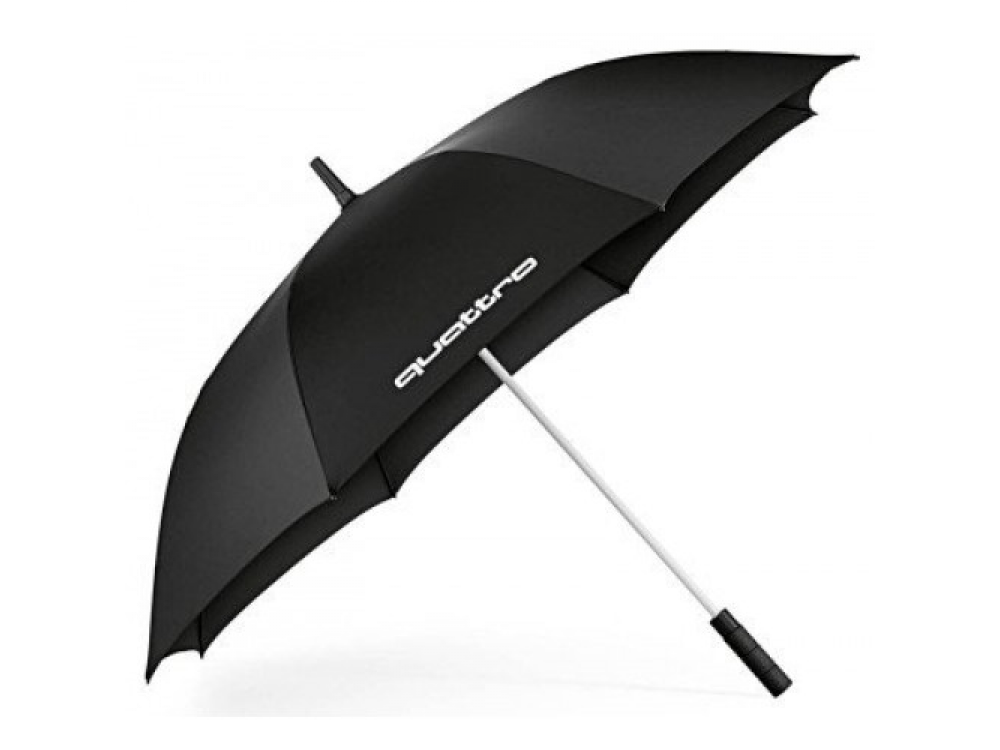 Большой зонт-трость Audi Qattro. Черный купол с белым валом. Спицы из стекловолокна. Приятная на ощупь пластиковая рукоятка с декоративным отпечатком, стилизованным под протектор шин Audi Quattro. Вес: прибл. 700 г. Диаметр купола: 130 см., длина трости: 101 см. Материал купола: 100% полиэстер. Артикул: 312.16.001.00